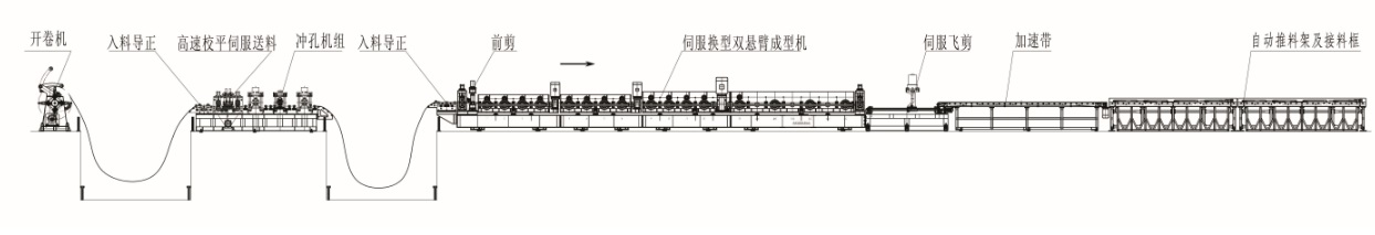 開卷機---入料導正--伺服送料--沖孔機組---導正---前剪---成型部分---伺服飛剪----加速帶----自動碼垛機