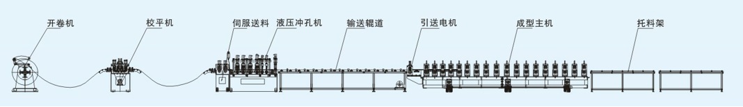 TF光伏支架C型鋼冷彎生產線由開卷機、校平機、伺服送料機、沖孔機、輸送導道、成型主機、托料架組成。