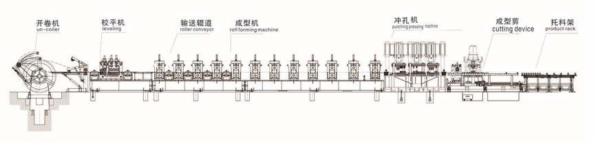 TF鋼板倉加強筋生產(chǎn)線具備中板開卷、校平、輥壓成型,定長沖孔、剪切、卸料等自動化流水生產(chǎn)功能。每一成型道次單獨電機驅(qū)動,節(jié)能減耗;主機一套輥輪模具可生產(chǎn)1.5-8mm厚的型鋼制件;專用大型壓力機,整體沖孔,確保裝配位置高精度要求;